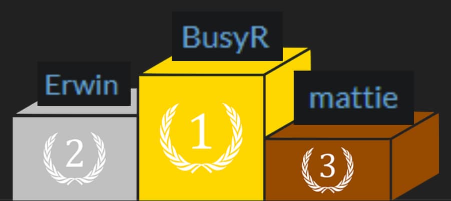 In totaal zijn er 60 challenges gepubliceerd en zijn deze allemaal ten minste één keer opgelost. In de top drie zijn uiteindelijk geeindigd: Erwin, Mattie en BusyR! Nogmaals gefeliciteerd!