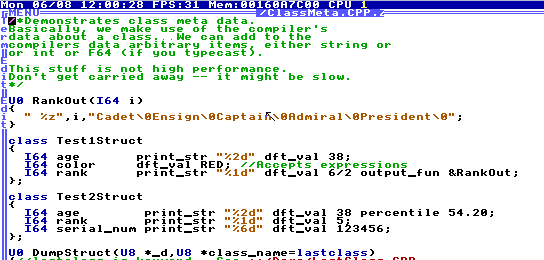 Een ander interessant aspect van TempleOS is dat het in tegenstelling tot Unix alles opslaat in DolDoc format. DolDoc is echter niet alleen voor tekst, er kunnen afbeeldingen, 3D meshes direct worden opgeslagen. Macro’s zijn ook mogelijk, hyperlink commands die aan de slag gaan zodra je er op klikt. Een menu is dus makkelijk gemaakt, je maakt gewoon een nieuw tekstdocument en zet er links in.