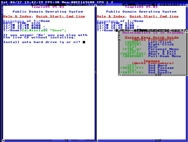 Los van de x64 assembly op de wat lagere niveaus is TempleOS volledig geschreven in HolyC. Volgens Davis was HolyC minder dan C++, maar meer dan C. Wat verrassend is, is dat dezelfde programmeertaal ook gebruikt wordt voor de shell. Inderdaad, je kan in de shell commando’s uitvoeren door in HolyC te tikken waarna het direct in de compiler wordt gegooid.